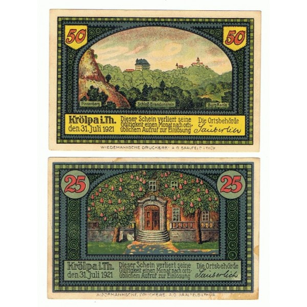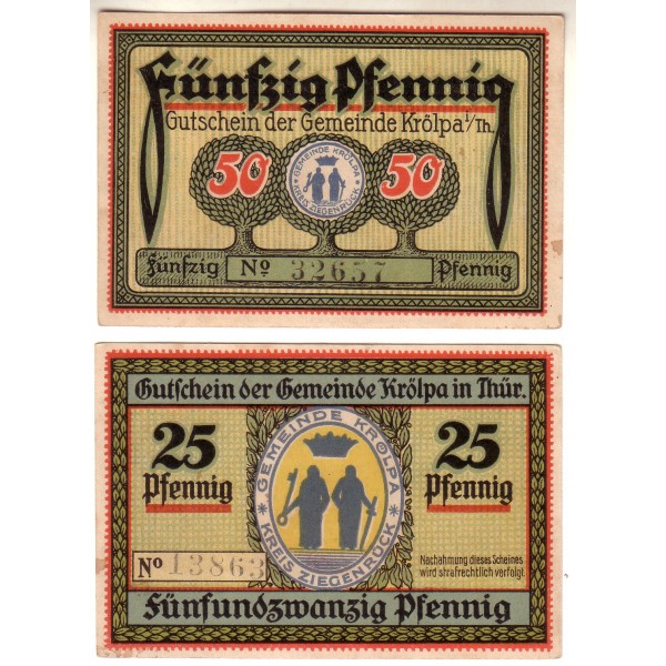 LOTE FORMADO POR 2 NOTGELD ALEMANES DEL AÑO 1921 DE LA LOCALIDAD DE KRÖLPA.