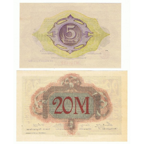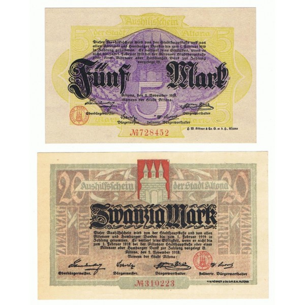 BILLETES DE ALEMANIA DE 5 Y 20 MARK DEL AÑO 1918 DE LA LOCALIDAD DE ALTONA.