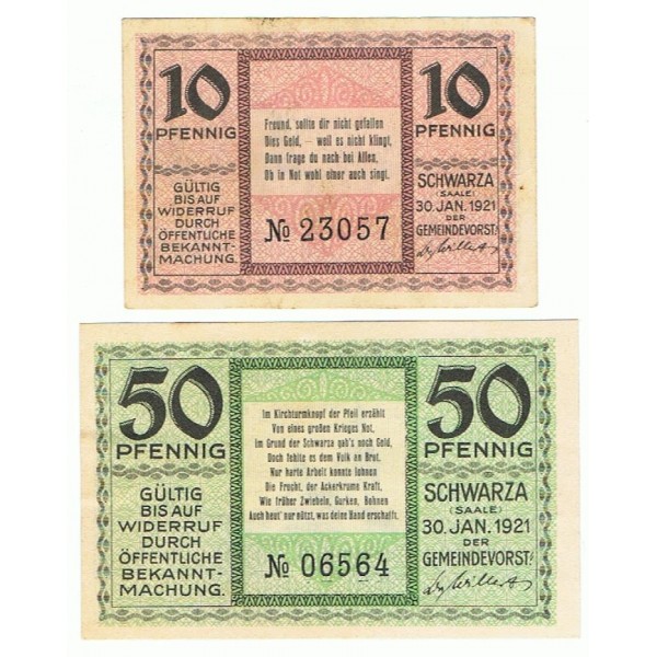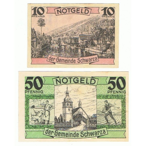 LOTE FORMADO POR 2 NOTGELD ALEMANES DEL AÑO 1921 DE LA LOCALIDAD DE SCHWARZA.