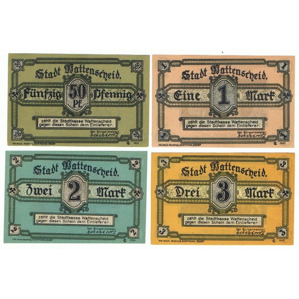 LOTE FORMADO POR 4 NOTGELD DE ALEMANIA DEL AÑO 1921 DE LA LOCALIDAD DE WATTENSCHEID.