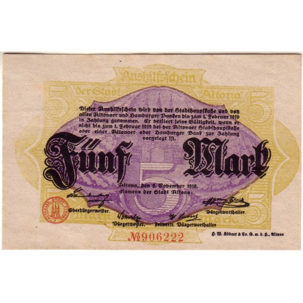 BILLETE ALEMÁN DE 5 MARCOS DEL AÑO 1918 DE LA LOCALIDAD DE ALTONA.