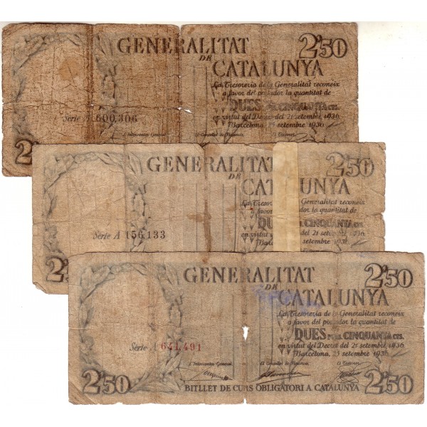 LOTE FORMADO POR 3 BILLETES DE 2'50 PESETAS DEL AÑO 1936 DE LA GENERALITAT DE CATALUÑA.
