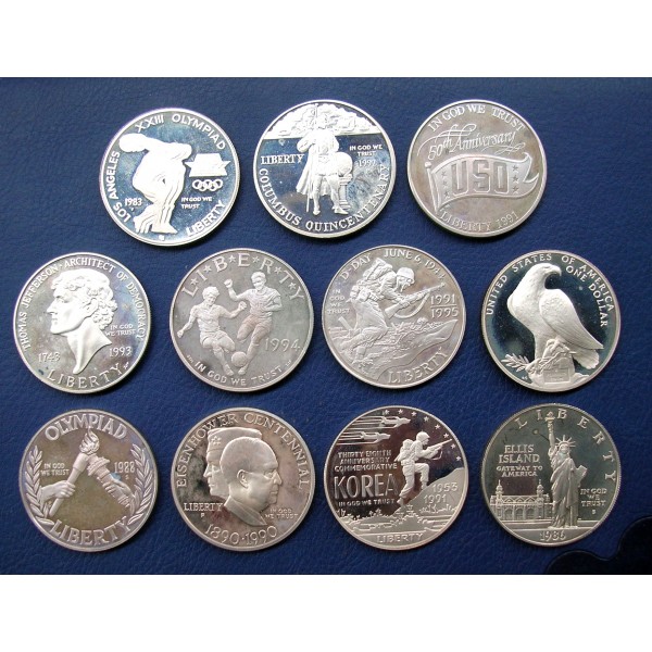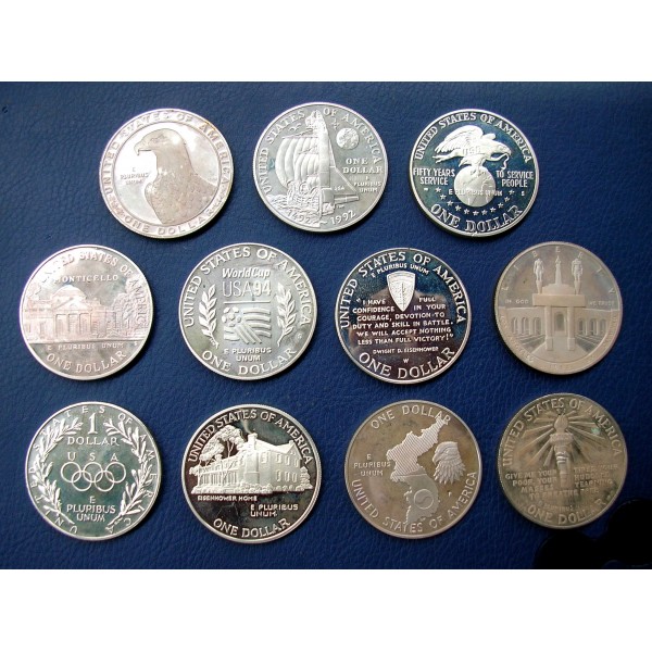 LOTE FORMADO POR 11 MONEDAS DE PLATA CONMEMORATIVAS DE 1 DÓLAR DE ESTADOS UNIDOS.