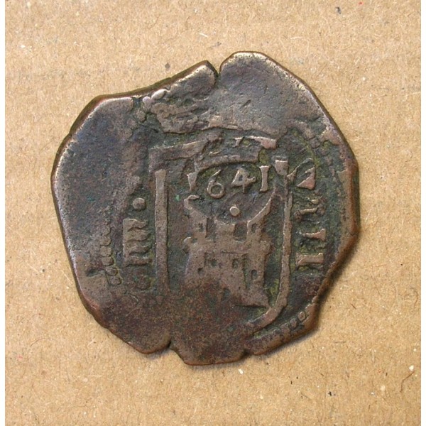 PRESENTA UN RESELLO POSTERIOR DE VALOR 8 MARAVEDÍS (VIII) ACUÑADO EN EL AÑO 1641 EN SEVILLA (S).